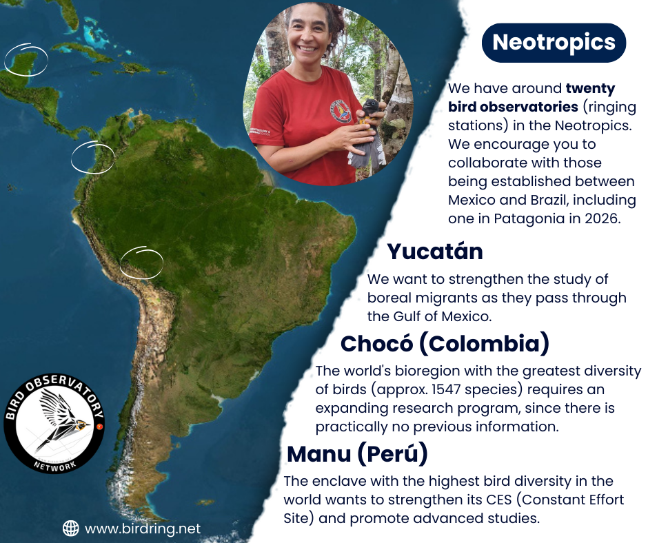 Ponemos a vuestra disposición un abanico de Bird Observatories distribuidos por México, Colombia, Ecuador, Perú y Brasil. Una propuesta de forjar estaciones permanentes de anillamiento de aves. Ubicadas en lugares de altísima importancia migratoria pero también de la máxima diversidad ornítica, como la reserva de la biosfera del Manu en Perú, con 1047 especies de aves, o las establecidas en Colombia, el país del mundo con mayor diversidad de aves. En el Chocó colombiano se estiman 1546 especies, situándola como probablemente la bioregión del mundo con más especies de aves. Las estaciones de Ecuador, el país con mayor diversidad por superficie o los estratégicos manglares de Yucatán, donde pasamos de la selva a los humedales y todo el flujo de migradores boreales.