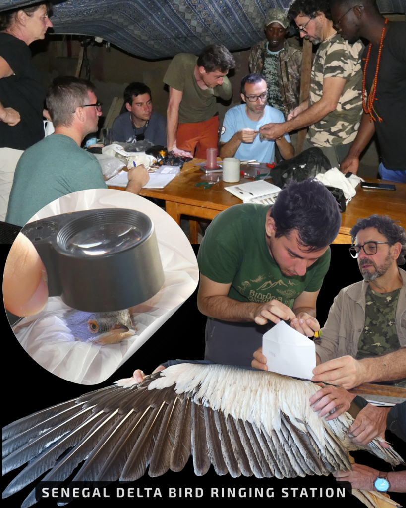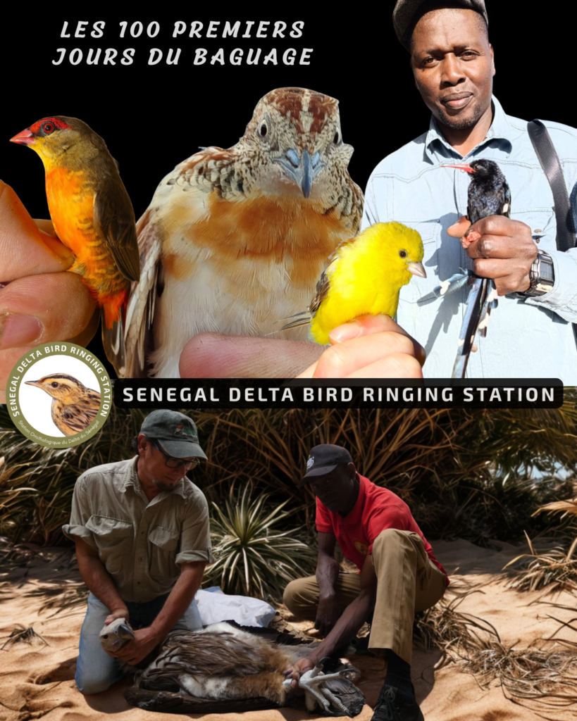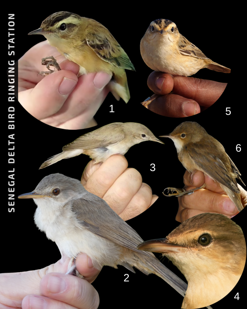 Acrocephalus scirpaceus (3) est également très abondant, tandis qu’Acrocephalus arundinaceus (4) est présent partout, mais en plus petit nombre. En revanche, Acrocephalus paludícola est habituel mais beaucoup plus rare, bien que dans les marais appropriés, il soit légèrement plus fréquent. Enfin, Acrocephalus baeticatus (6) est l’espèce la plus rare dans les milieux où nous intervenons et sa limite septentrionale de répartition se situe au fleuve Sénégal. En 100 jours, nous n’avons encore trouvé aucun Acrocephalus palustris.