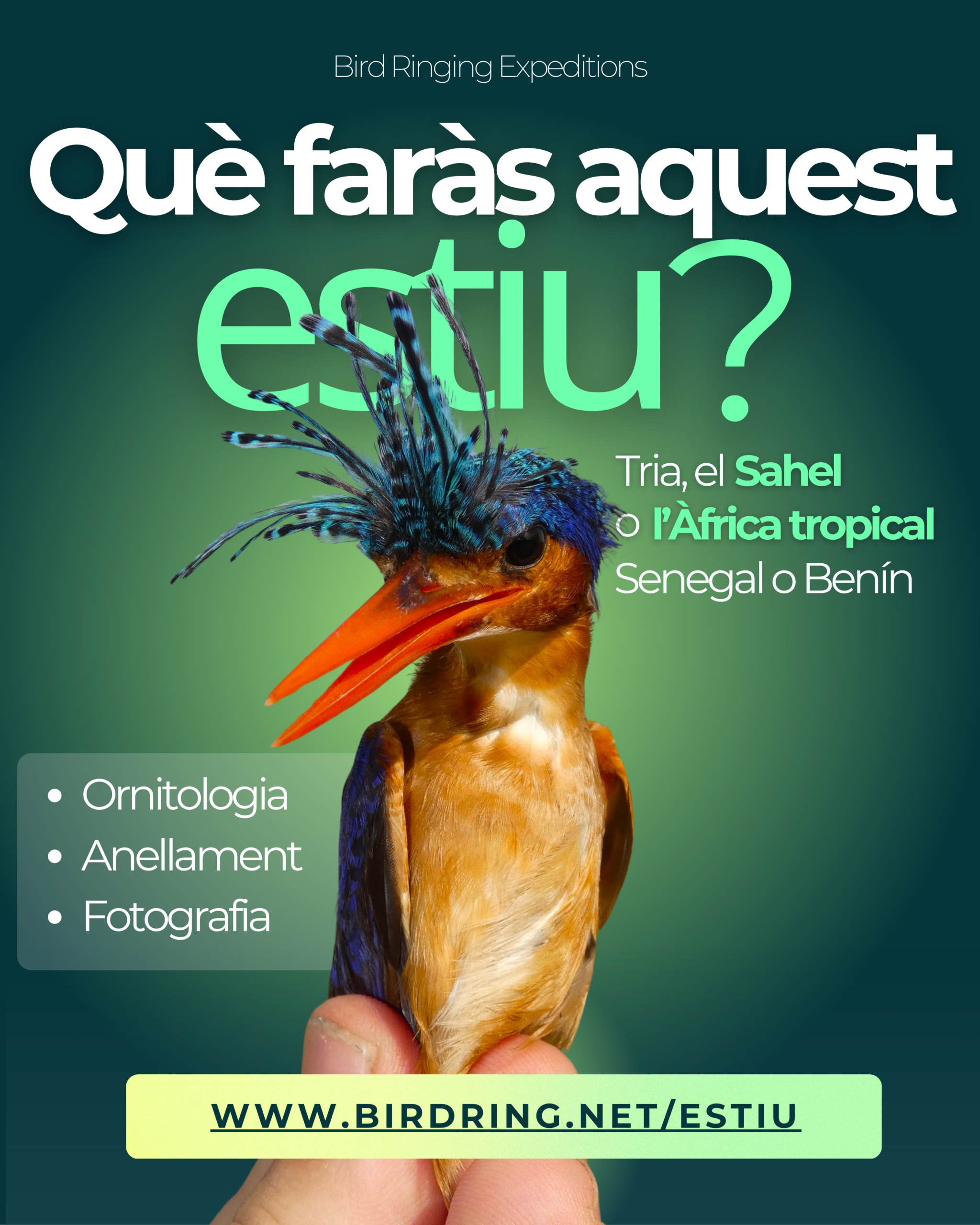 Tots els mesos tenim un campament d’anellatge a un país diferent. L’objectiu és ajudar a crear estacions ornitològiques pels ornitòlegs del país, amb el suport de parcs nacionals i reserves de la biosfera, les universitats i entitats de referència i, per descomptat, de la mà de l’administració nacional corresponent.