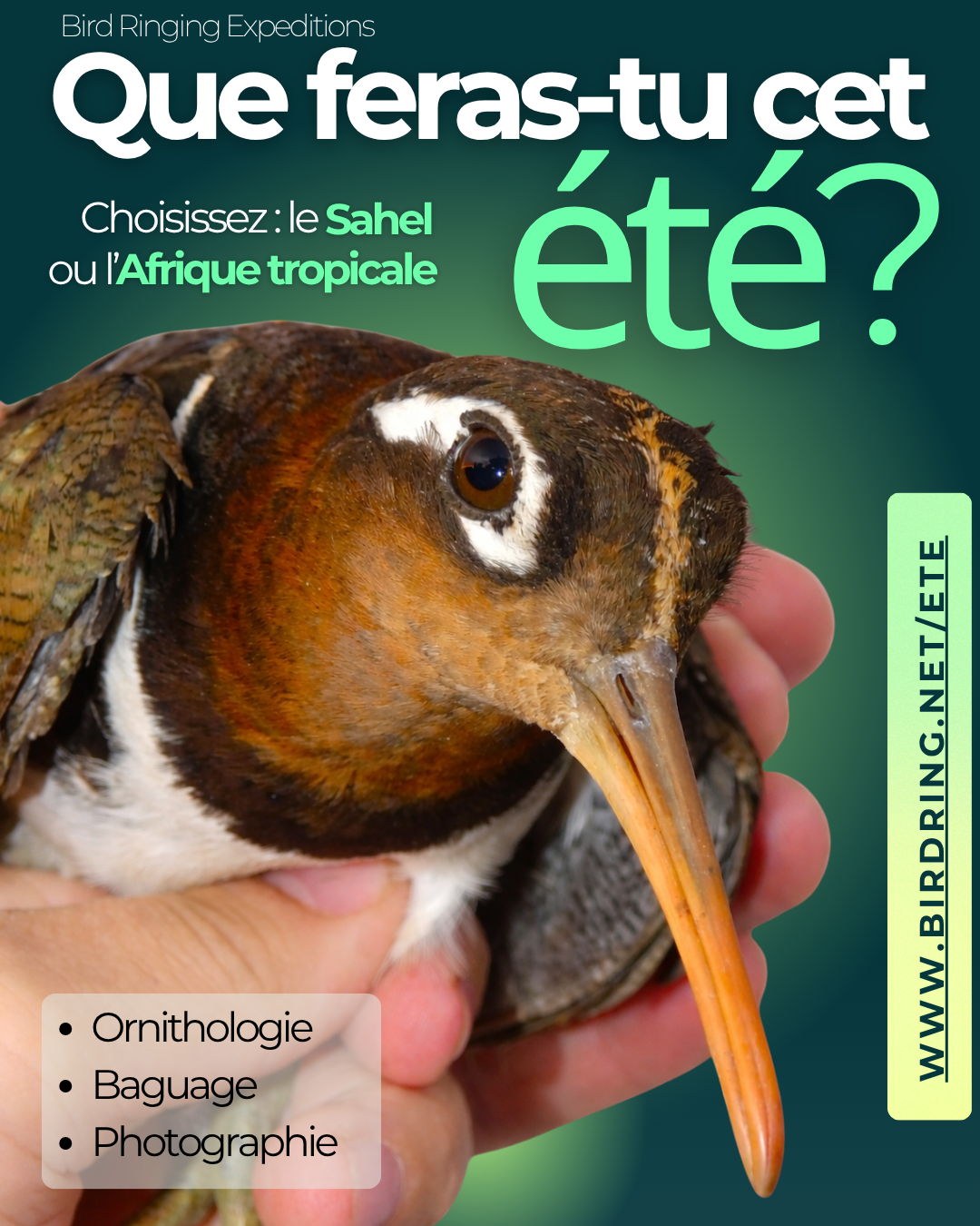 Participer à un étalonnage de bagueurs d’oiseaux est une autre excellente occasion d’apprendre et de pratiquer avec les meilleurs, de rafraîchir vos connaissances ou d’évaluer votre précision. Les prochains auront lieu au Bénin, au Sénégal, en Côte d’Ivoire, au Burkina Faso et en Éthiopie.