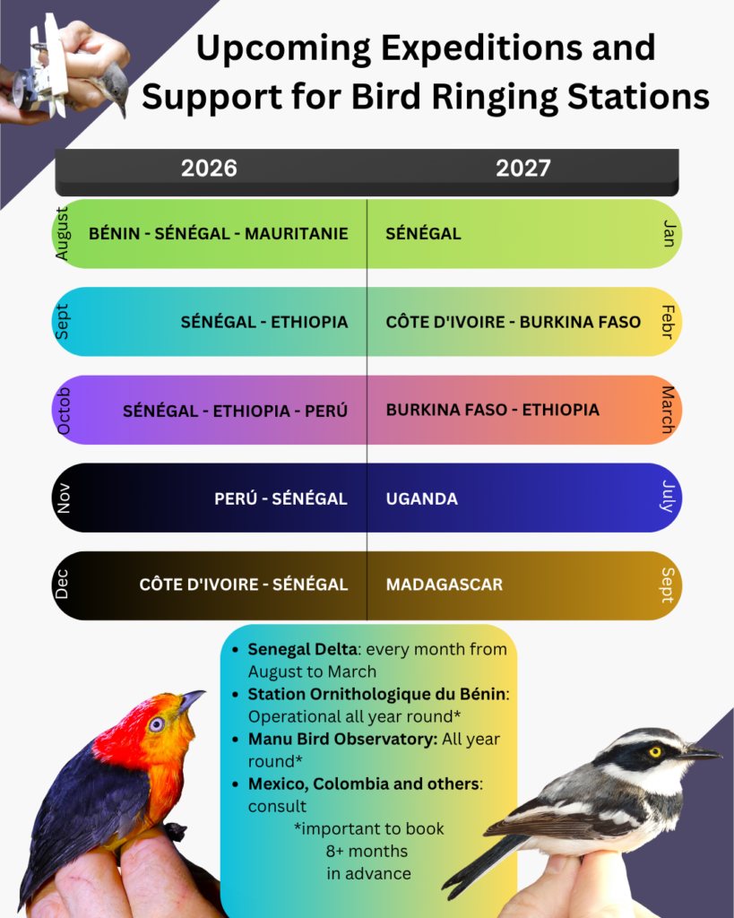 Another great opportunity to learn and practice with the best, refresh your knowledge, or assess your accuracy is to participate in a Bird Ringer Calibration. The next ones will be held in Benin, Senegal, Ivory Coast, Burkina Faso, and Ethiopia.