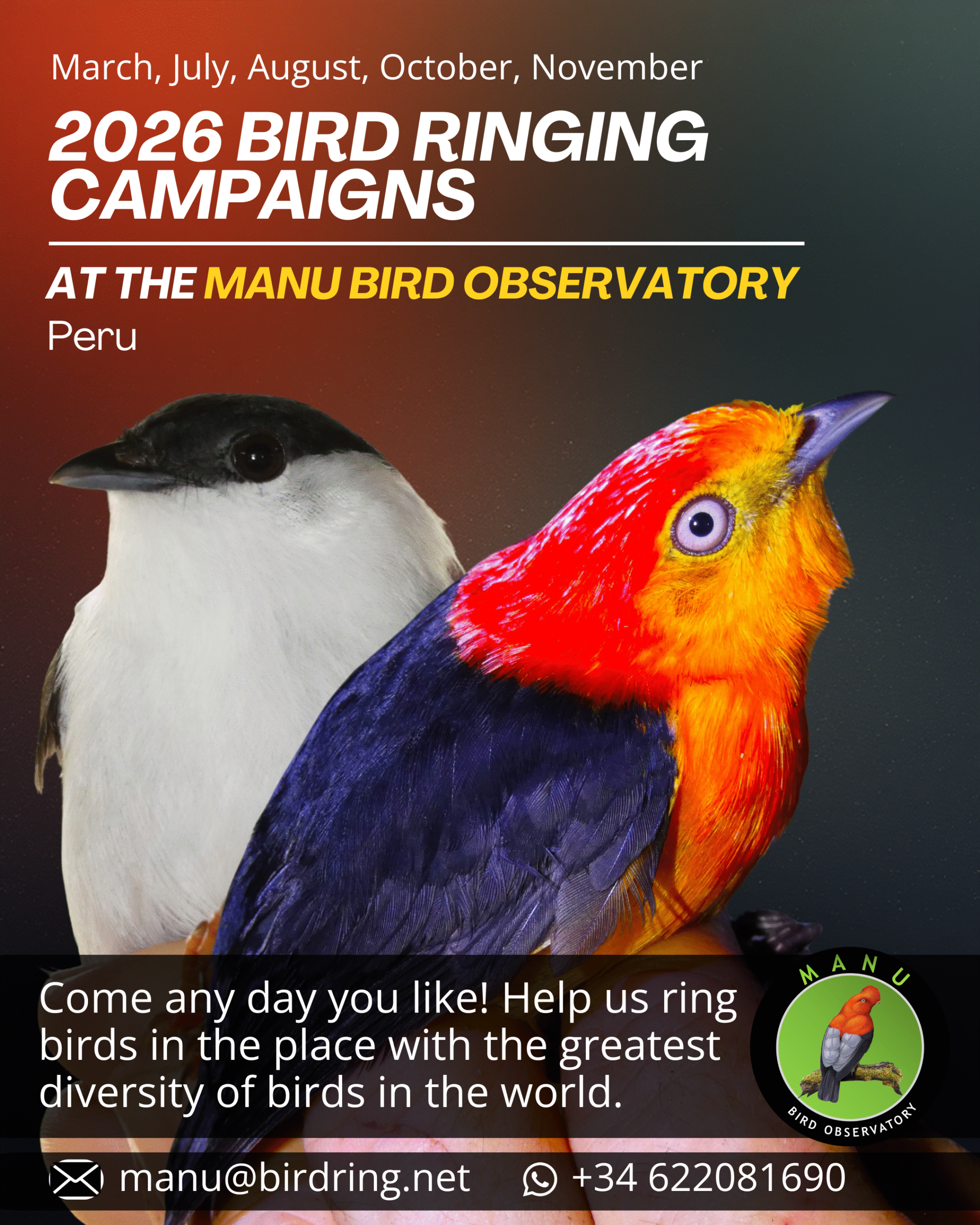 The first constant effort site in the Neotropics was created at the Manu Bird ObservatoryBird ringing takes place throughout the year, but every October a ringing camp is organised with some of the greatest ringers from all continents, to bid farewell to the last southern migrants and welcome the first boreal ones. 1,048 species of birds have been recorded at Manu, making it the place with the greatest bird diversity on the planet.