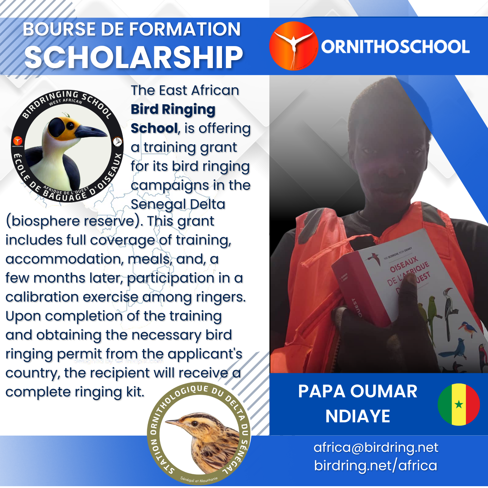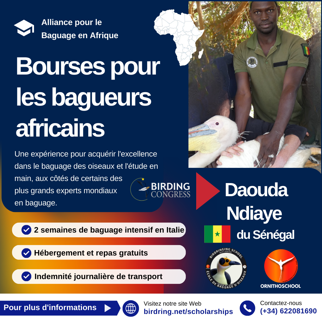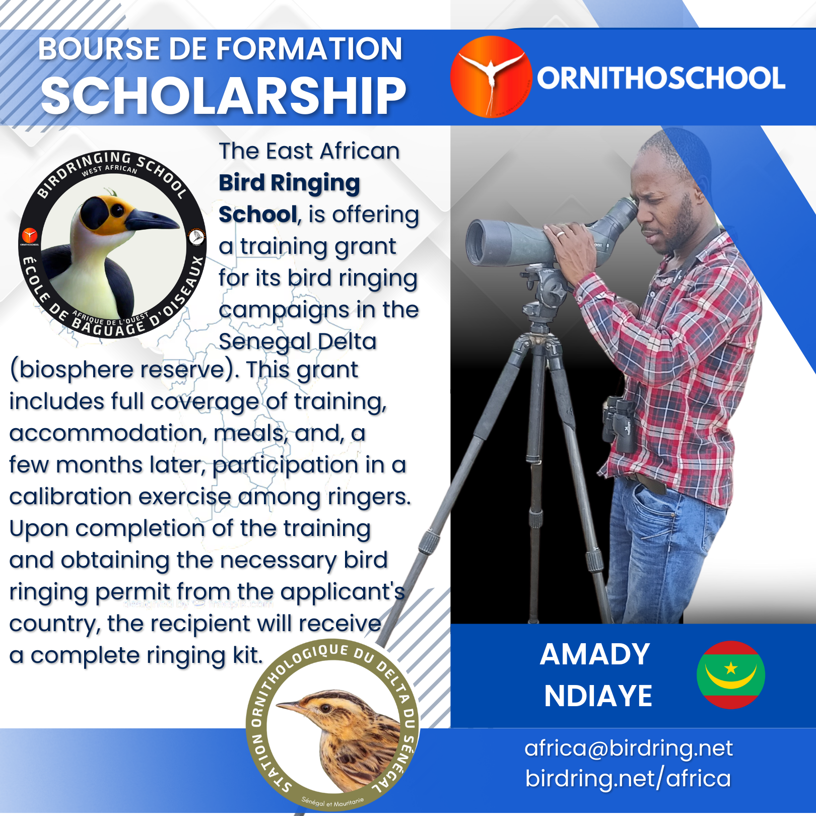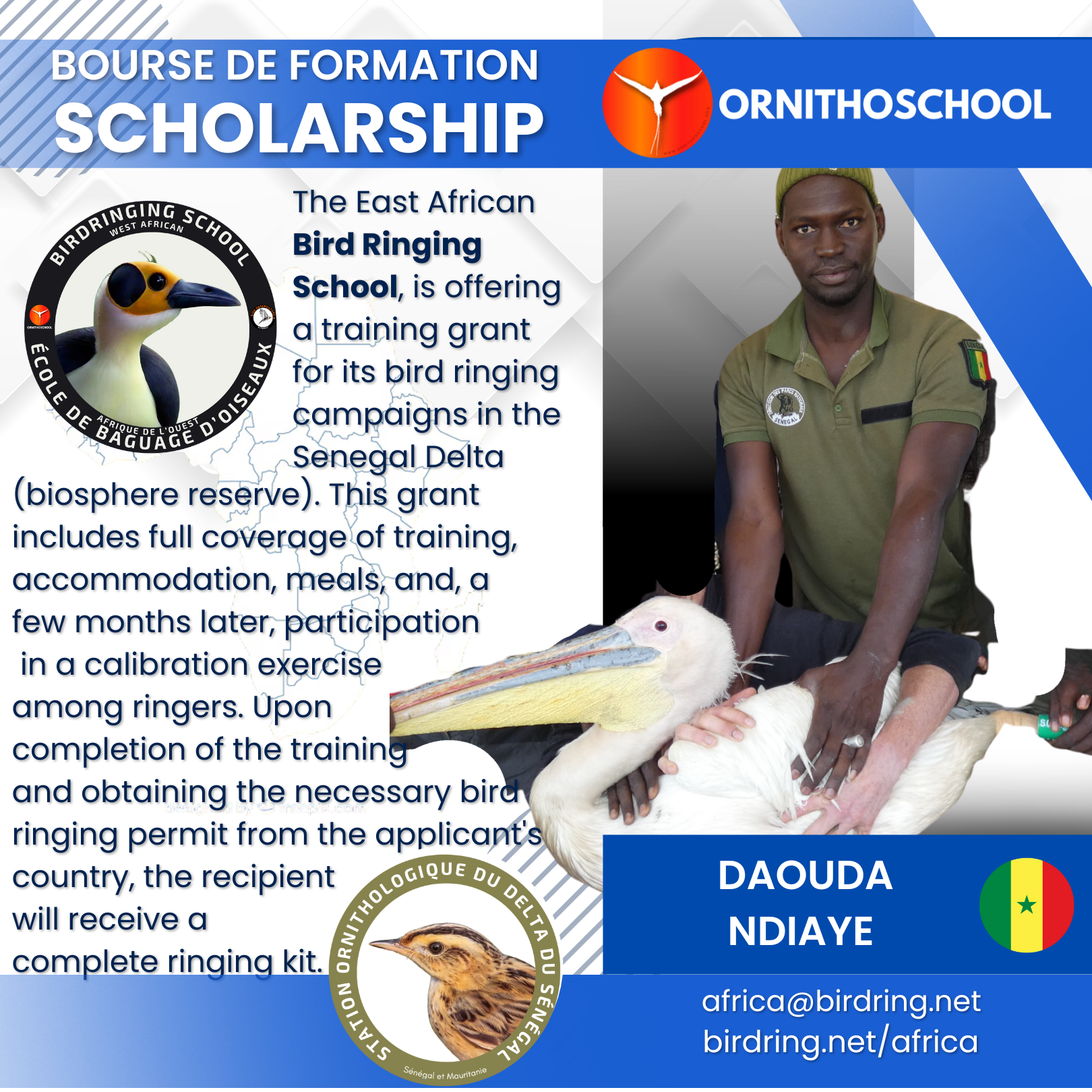 L’ Station ornithologique du delta du Sénégal (qui bague les oiseaux du Parc National des Oiseaux, du PN de la Langue de Barbarie et PN Diawling) offre des bourses de formation pour ses campagnes de baguage au Sénégal et la Mauritanie. La bourse comprend la formation, l’hébergement et les repas entièrement gratuits. Une fois la formation terminée et le candidat ayant reçu son permis de baguage (délivré par le gouvernement local), il recevra l’équipement technique complet.