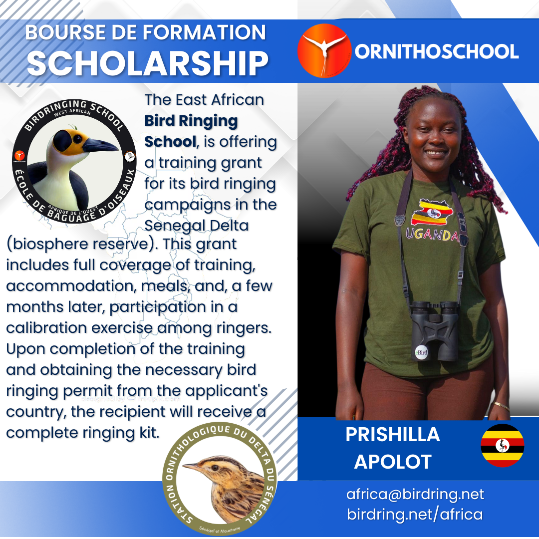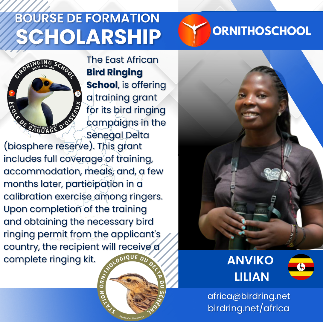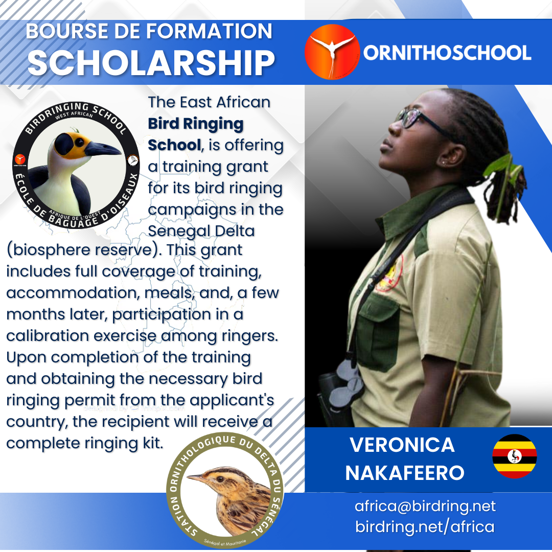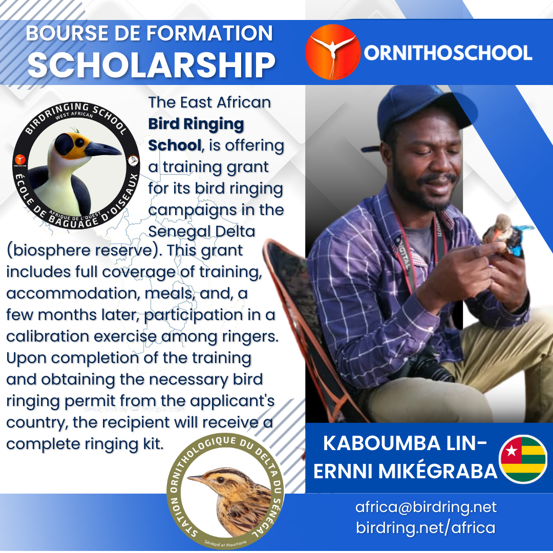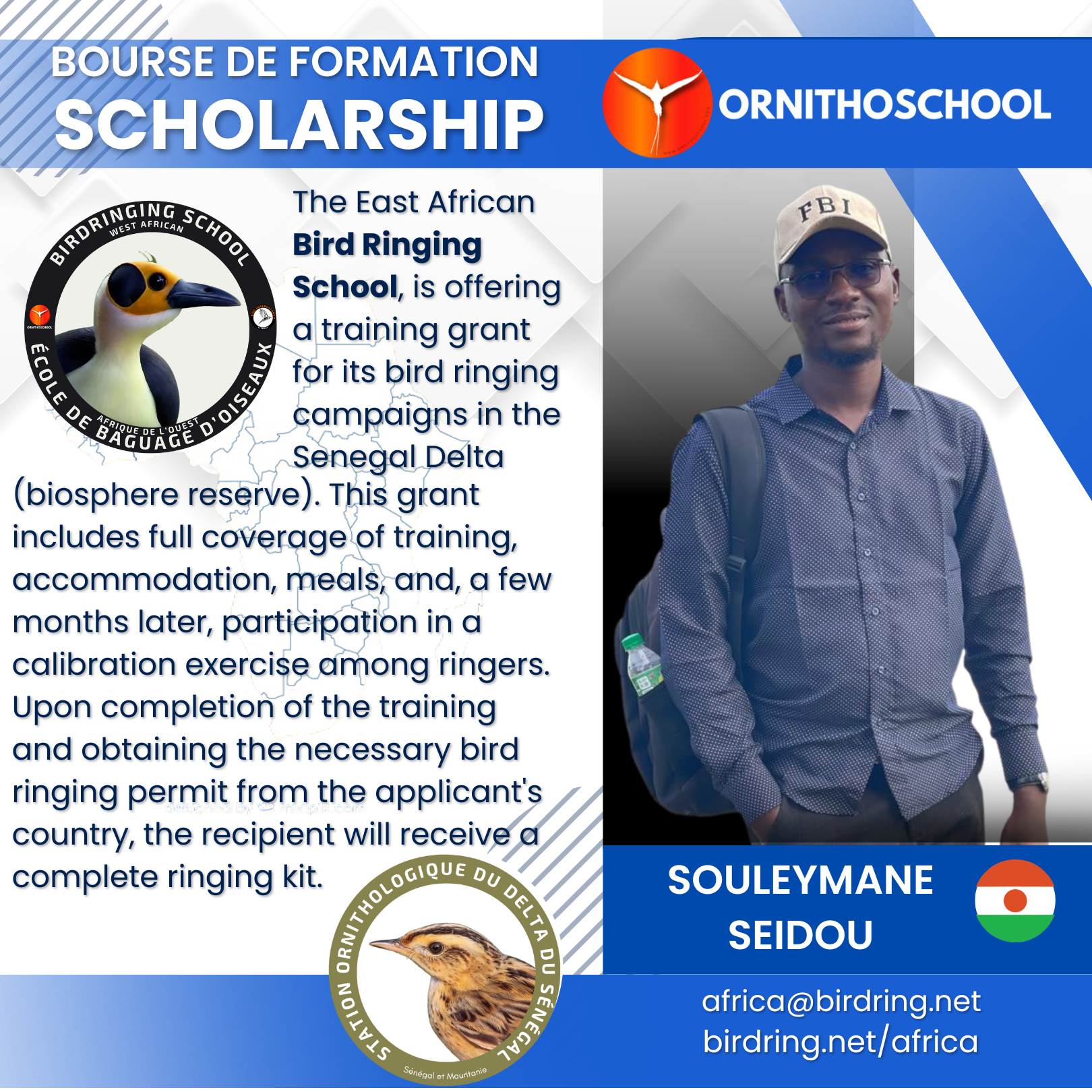 L’ Station ornithologique du delta du Sénégal (qui bague les oiseaux du Parc National des Oiseaux, du PN de la Langue de Barbarie et PN Diawling) offre des bourses de formation pour ses campagnes de baguage au Sénégal et la Mauritanie. La bourse comprend la formation, l’hébergement et les repas entièrement gratuits. Une fois la formation terminée et le candidat ayant reçu son permis de baguage (délivré par le gouvernement local), il recevra l’équipement technique complet.